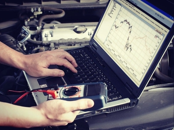 - Компьютерная диагностика. Выполняется путем подключения сканера к бортовому компьютеру автомобиля. Сканер считывает код ошибки, мастер расшифровывает его. Также сканер показывает важные для работы параметры: температура в системе, давление и др.